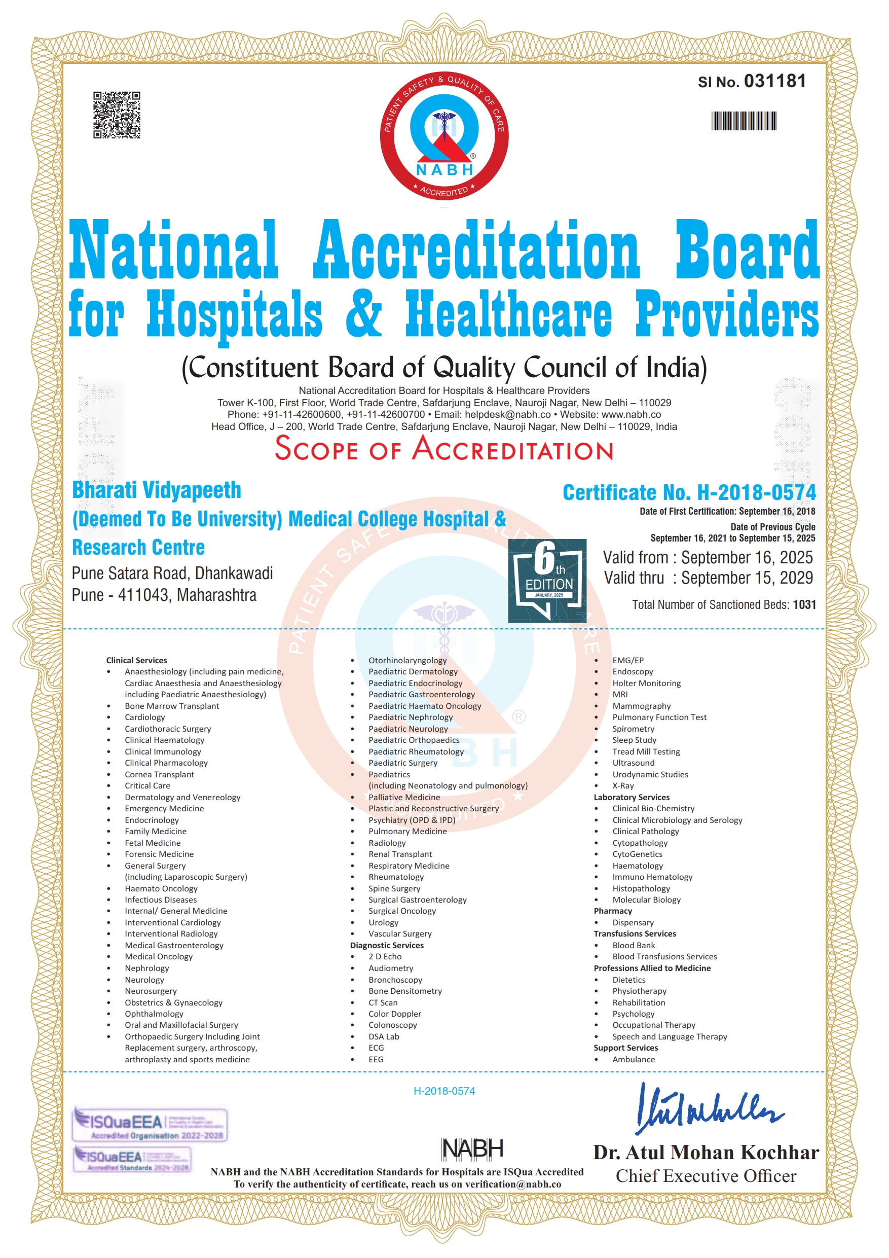 Bharati Hospital has been awarded A+ grade by Government of Maharashtra under the Mahatma Jyotiba Phule Jan Arogya Yojana. The clinical laboratory of the hospital is NABL accredited and the Emergency Medicine Department, Blood Bank and Ethics committee are NABH accredited. We are also accredited by NABH for Nursing Excellence.